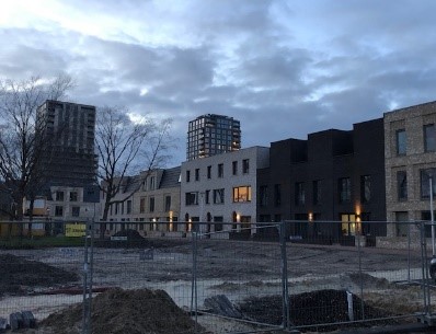 De huizen waren tijdens mijn bezoek al zo goed als af, alleen aan de ruimtes rondom de huizen (de openruimtes) moest er nog veel gedaan worden. Naast dat de huizen zo goed als af zijn, zijn ook de drie appartementen complexen zo goed als af.